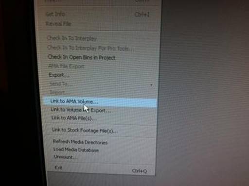 Editing and feeding: Place your SxS card in the reader before you open up the Avid program, this will allow the clips to populate into the AMA bin. If you forget or have to change cards you will have to link to the reader as follows.
